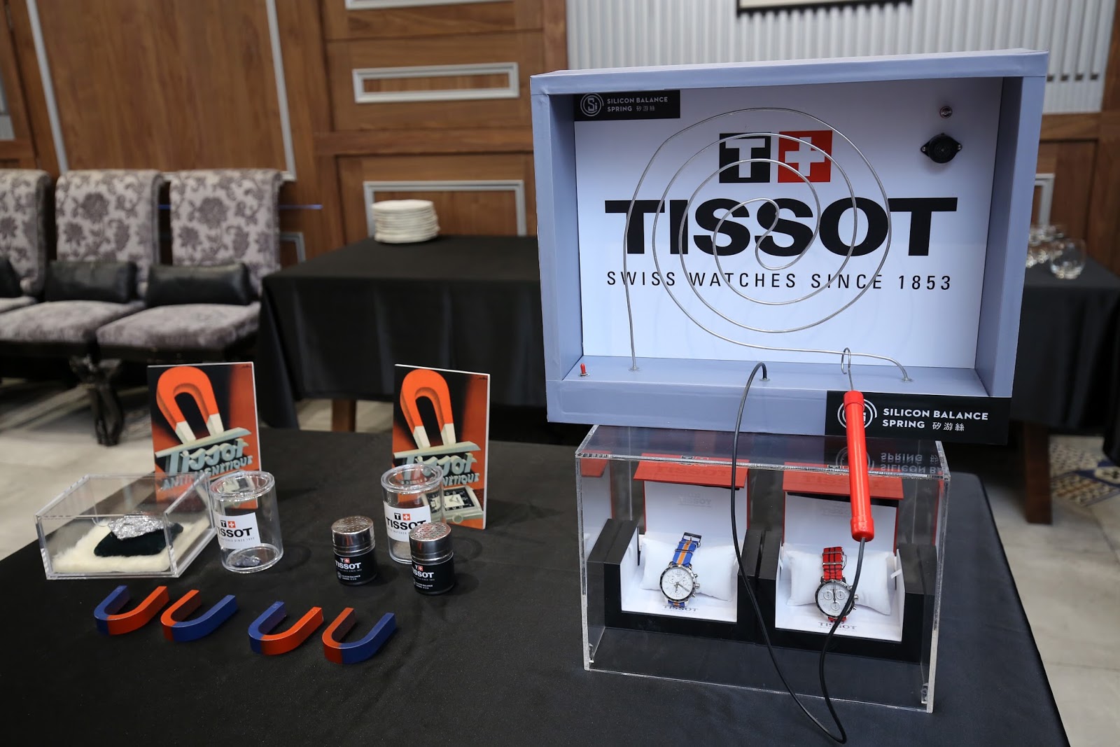 為展示此項革命性的突破,瑞士天梭表特別於2017年2月13日假台北101購物中心一樓信義路門口的Road Show展示空間前舉辦開春首場媒體鑒賞會。活動上更邀請到女星陸明君及名模張瀚元一同展演全新升級寶環系列矽游絲COSC腕錶;該展間內除了新品外,亦擺放了多只經典男、女錶款,例如天梭競速系列2016 MotoGP限量版、Tissot NBA特別款腕錶、天梭駿雅系列等等,供到訪的媒體與消費者欣賞與親身體驗把玩。活動上, 天梭表更邀請媒體朋友換上白袍親自操作在有鐵粉與矽材質原石與衍生物件的平台上,比較與體驗矽材質的抗磁性、同時體驗以矽游絲造型製作的「電流急急棒」物理遊戲,並透過品牌集團維修中心專業研發維修師傅的介紹與影片的播放來讓與會者了解天梭表品牌如何透過DIRE深反應離子蝕刻技術來製作矽游絲,並讓搭載在全新升級寶環系列矽游絲腕錶的機芯能精益求精。 並也突顯抗磁性對時計工具精準度的重要性。全新升級Ballade寶環系列矽游絲COSC腕錶正因為同時兼俱了以下革命性的突破與特色: 同時搭載矽游絲與 80小時動能儲存、巴黎釘紋面盤與錶框,質感滿分、男女表款皆通過天文台認證、兼具話題與實際功效等; 所以讓此款全新升級Ballade寶環系列矽游絲COSC腕錶能從眾同級競品中脫穎而出,堪稱史上最強、不容錯失的必買腕錶。也為即將到來的情人節慶; 提供了最佳的對錶選擇品項。